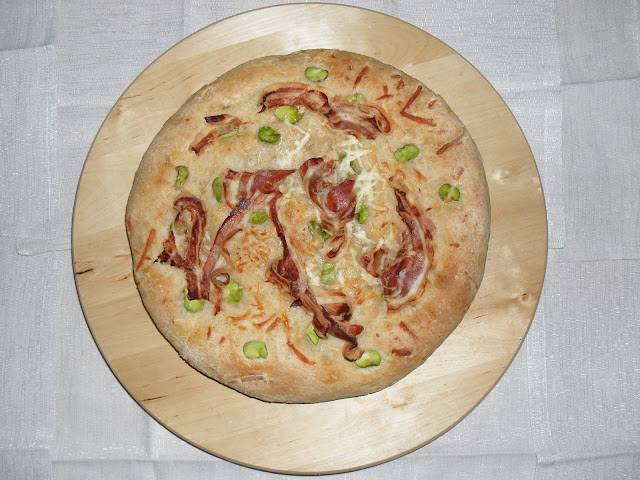 • Su di una aggiungere i pomodori secchi in superficie, mentre sull’altra le fave private della pellicina esterna, il pecorino in scaglie e infine la pancetta;